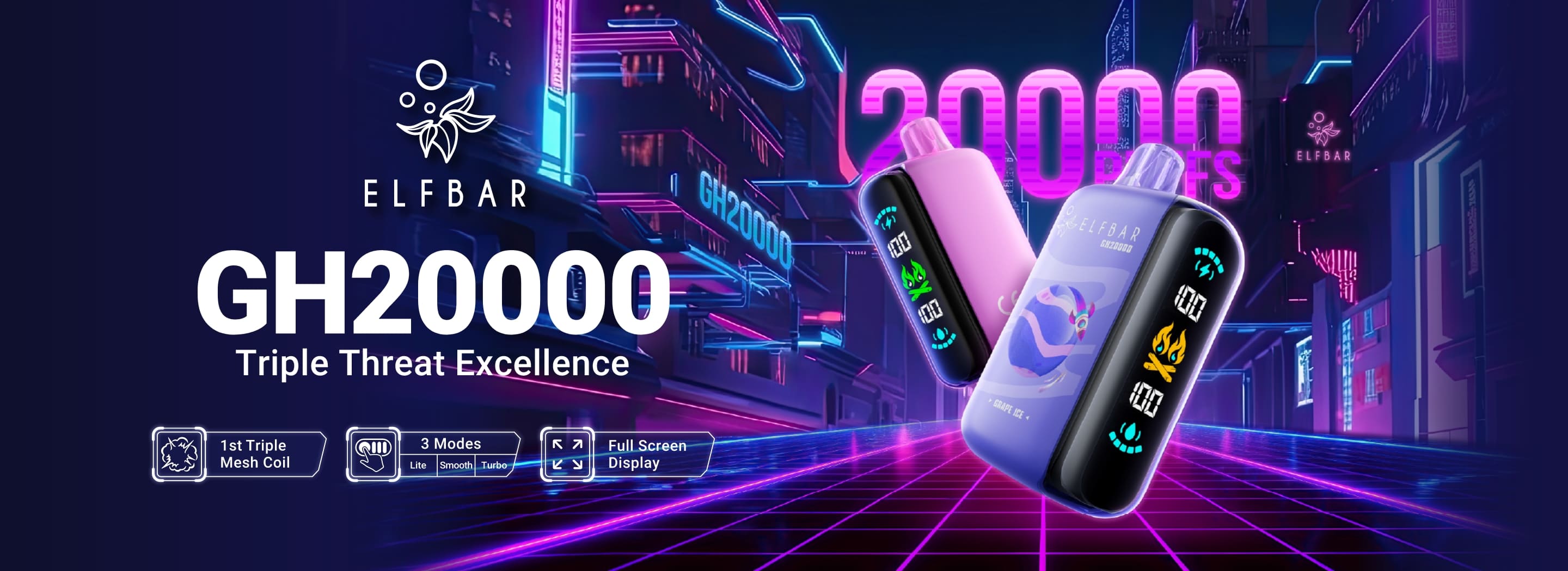 - Elf Bar GH20000 – The ultimate high-capacity disposable vape, delivering up to 20,000 puffs with bold Elf Bar flavours like Miami Mint, Mango Vape, and more.